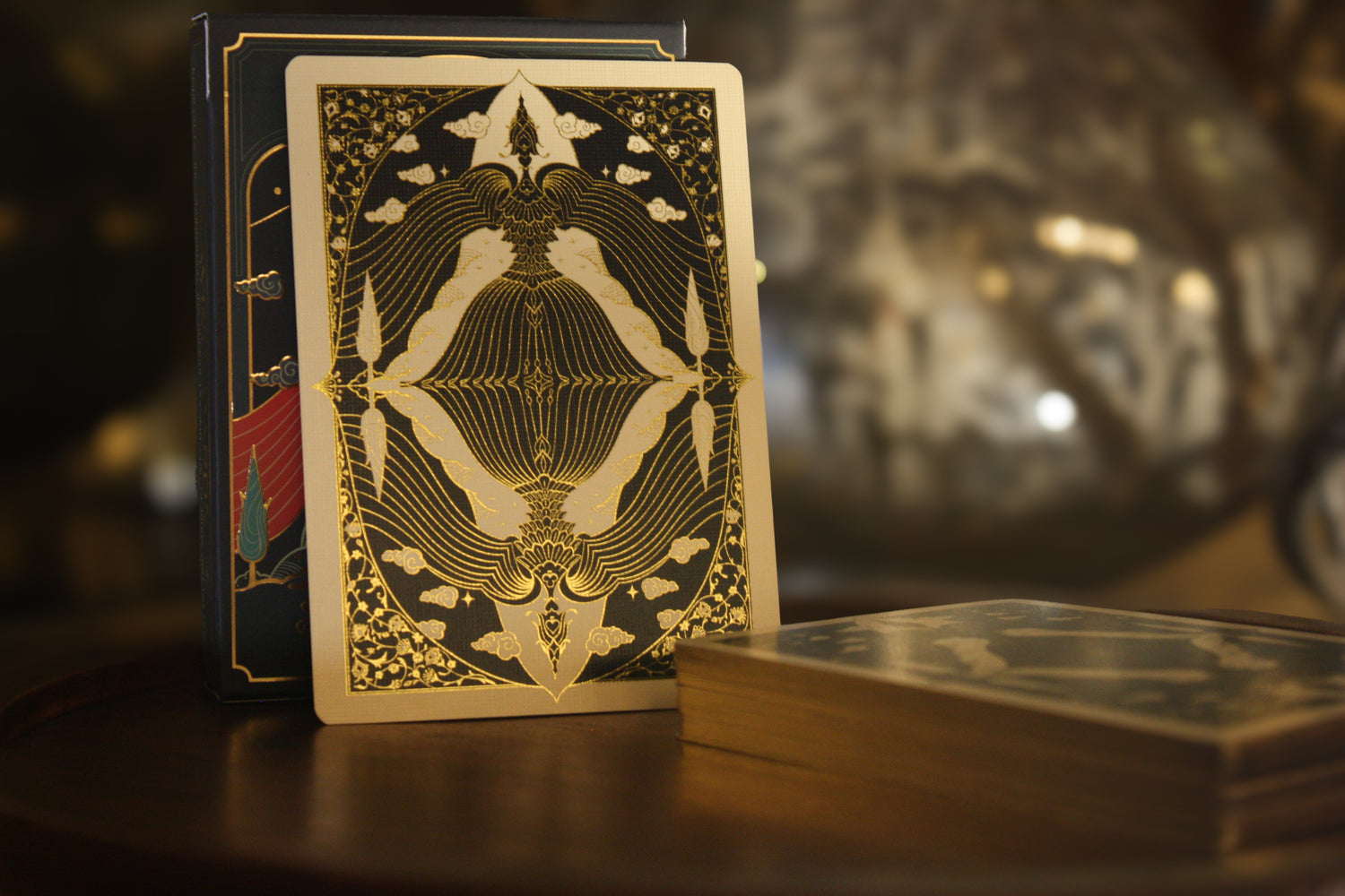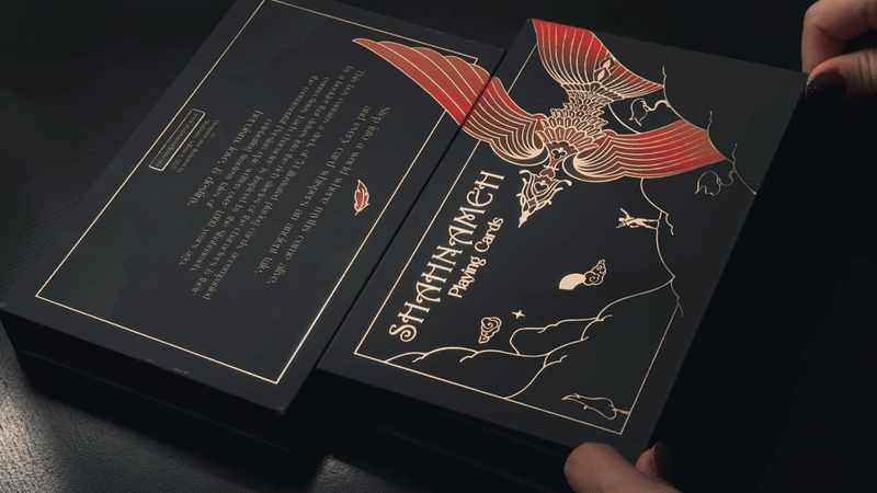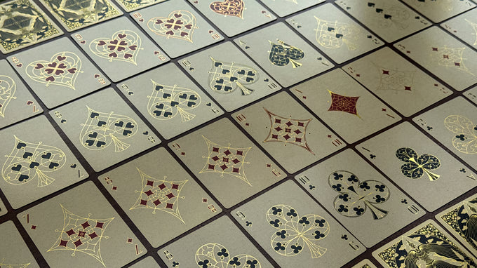 Poker-sized with gilded edges, printed on 300gsm German black-core paper with a linen finish for smooth handling and lasting quality. Each card features cold foil accents on both sides, adding a brilliant, reflective touch that brings the artwork to life.