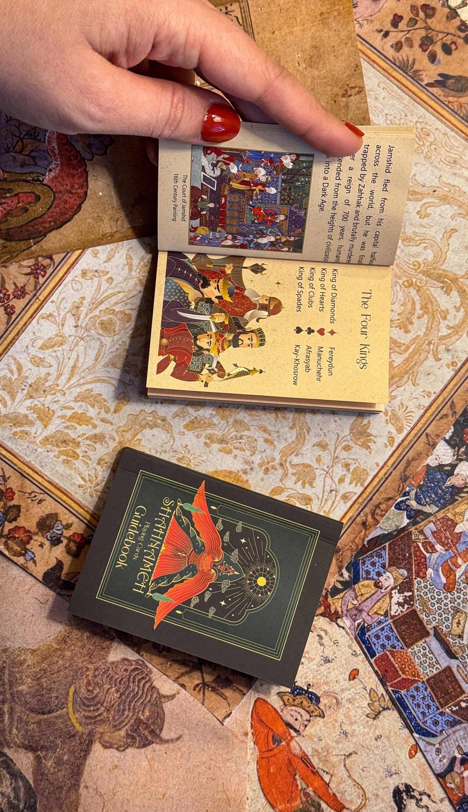 I designed the back with symmetry inspired by Persian rugs, and used foil and embossed details on all editions of the tuck box to echo the golden accents often seen in Persian miniature art.
